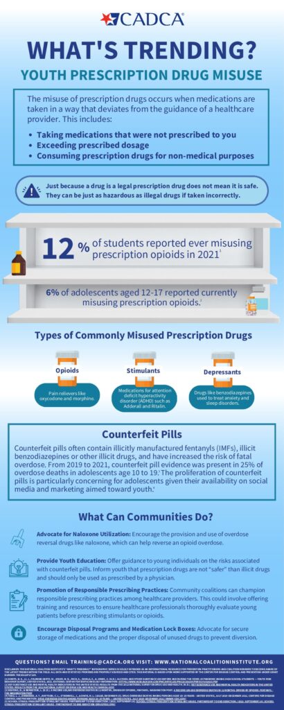 Explore the latest edition of CADCA’s What’s Trending infographic series, focusing on youth prescription drug misuse. Access this informative resource to educate your community and empower your coalition with action steps, such as advocating for naloxone utilization, collaborating with healthcare professionals and educators to enhance prevention efforts, and fostering awareness within the community.